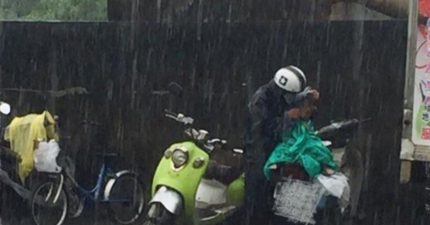 網友見祖孫倆在雨中等「別人吃剩的午餐」忍不住上前關心,一低頭看到小孫子的表情讓她立刻當場落淚…