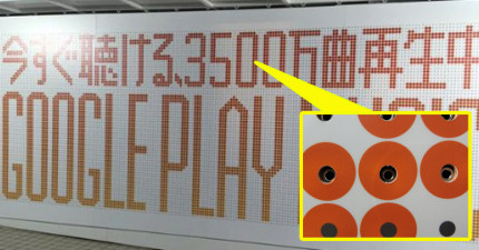 日本東京街頭上的廣告招牌遠看還沒什麼,走近看卻發現到牆上全都是密密麻麻的耳機孔!