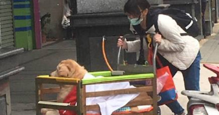 他上前問這名女孩為什麼要用推車帶黃金獵犬散步,結果聽完答覆後瞬間就被感動到當場噴淚…