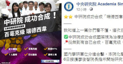 中研院宣佈成功合成「治療武肺藥物」 7人團隊加班14天完成「瑞德西韋」!