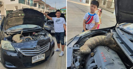 影/打開引擎蓋驚見「巨大蜥蜴」嚇傻 牠「睡到翻肚」要2個人才能抬走!