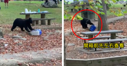 野餐區出現「冰桶小偷熊」 左推右推打不開…整箱搬走好了