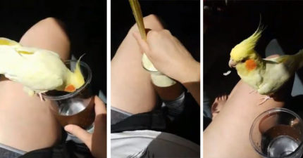 小鸚鵡站杯子喝水 腳一滑「噗通入水」嚇到掉毛:哈啾!哈啾!
