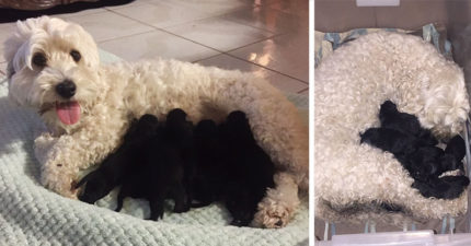 兩隻白色狗狗竟然生了一大堆「黑色毛寶寶」,狗爸爸看到時「表情超臭」!