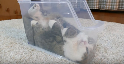 他放一個塑膠容器在地上看看自虐的貓咪會不會塞進去,最後近看他臉部表情時真的讓人笑噴了!