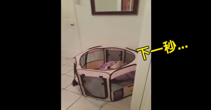 主人一直很狐疑想說小狗狗怎可能逃出狗籠,當他偷偷拍攝時就發現到原來是奸詐貓咪的天才拯救計畫!