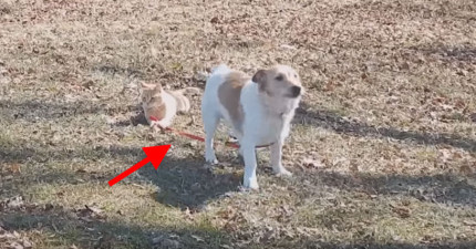 這隻貓咪想要讓狗狗奴才知道誰是老大,看看他拿著狗繩的超跩舉動!