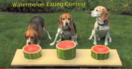 這3隻小獵犬比賽吃西瓜的模樣會讓你感到立刻超清涼!