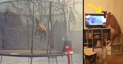 狗狗在电视上看到跟他同款的狗狗在跳弹簧床,他马上开始100%模仿让我脑袋快炸掉了!