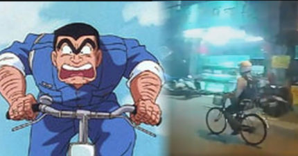 網友路上拍到戴全罩警察騎腳踏車根本「真人兩津」,有菜籃讓他笑噴!