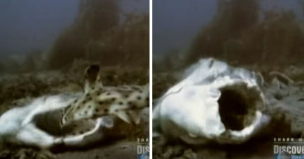 一條小公牛鯊慢慢游近一條天使鯊,下一秒就被吞掉了!但最後勝者居然是小公牛鯊?!