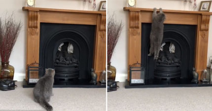 計算失誤!喵老大蹲地測量 下秒一跳直接變「拉單槓」:沒事朕安好
