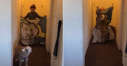 影/消失遊戲失敗版!小男孩找狗狗玩 丟毯子瞬間秒撲倒:還好不4藏獒