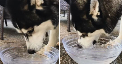 超傻二哈挑戰「吃水」 抱碗狂啃超疑惑:為什麼咬不起來?