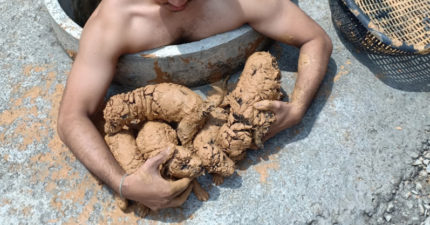 爆肌男井中撈出「5團泥巴球」 他沖水看真面目融化了