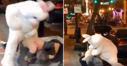 影/街上男子對女友亂來!復活節兔兔幫忙教訓「超喜感影片」笑翻網友:真人版勁量電池無誤
