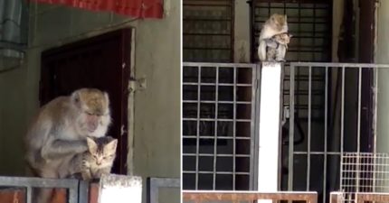 影/大胆孽猴「架走小猫」自以为没被发现 才抱走6秒…老妈锐利眼神直接吓尿!