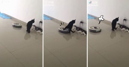 掃地機器人逼近! 黑貓忙吵架一腳轉向:去旁邊玩沙,別來煩我