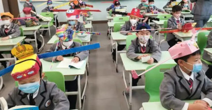 小學開學「戴一米帽」保持社交距離 網笑翻:文官上朝?