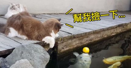 貓貓「玩具掉水裡」趴岸邊苦守 霸氣鯉魚哥「浮出水面」幫撿!