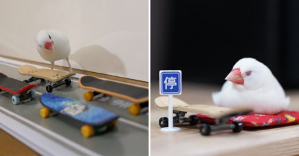 超可愛文鳥「其實是滑板天才」 斜坡一路狂溜「跳起來換板」牠也行!