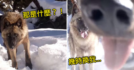 呆萌狼發現雪地「隱藏攝影機」下秒「鼻孔大放送」狂舔 同伴呆:有好料?