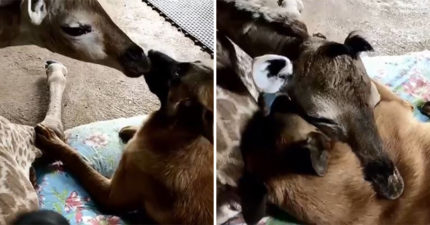 長頸鹿跟狗的「跨種族友誼」超有愛 每天形影不離「一起睡午覺」還互相理毛!