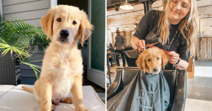 小黃金跟馬麻「一起上髮廊」 披斗篷坐好「歪頭困惑臉」太可愛!