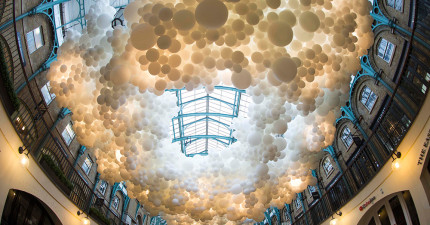 艺术家在英国著名市集升起了10万颗气球的积雨云,当全部打亮时…WOW!