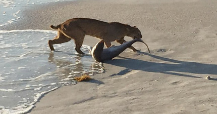 這個人在海邊拍到行蹤罕見的山貓剛出水,嘴裡叼著…?!
