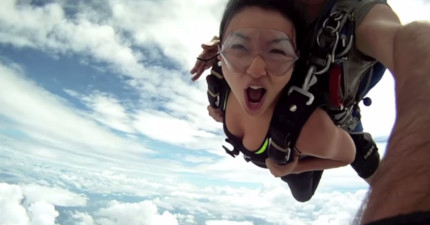 這個女遊客跟著教練高空跳傘,幾秒後飛機直接往他們衝去…