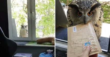 窗邊呆站一隻貓頭鷹 近看「叼著信件」:霍格華茲是真的!