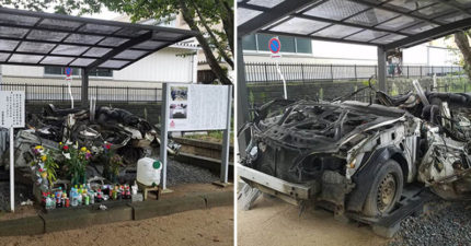 日本福島縣警局旁有著一輛「嚴重毀壞的汽車」供大家悼念,「背後超催淚故事」逼哭所有人!