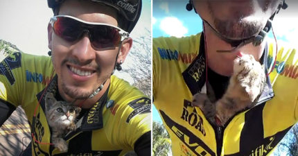 單車騎士在路上救了一隻小貓,塞到衣服騎回家的路程一直「被不停萌吻」! (影片)