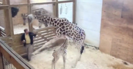 長頸鹿想要保護剛生出的小孩,完全知道人類男人的最大弱點!