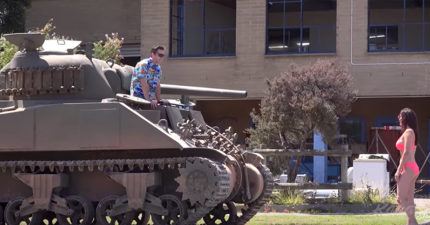 被辣妹拒絕的男子跳上「坦克」讓女生超後悔「想倒貼」,結果車子被「炸爛」…(影片)