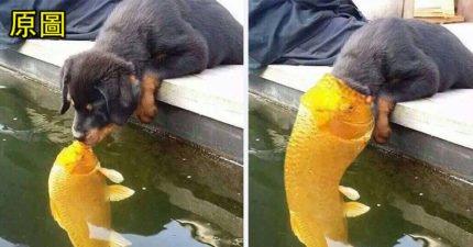 他拍到狗狗與魚「超有愛的親親畫面」 網友卻開始P圖大賽:這絕對是世紀之戀!