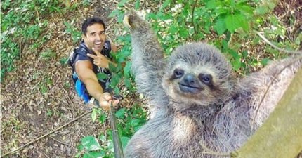 他本來想趁「快俠」還沒看到時偷偷跟他自拍,但沒想到一按下快門時最萌炸的畫面就出現了!