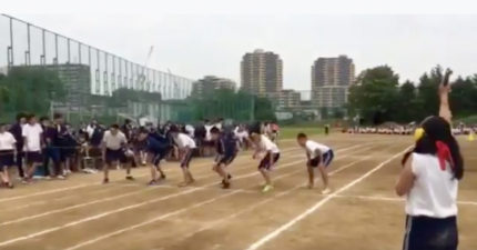 這群學生在起跑線上準備開跑,當槍聲一響起時,開槍的女學生就成為了”殺人兇手”!