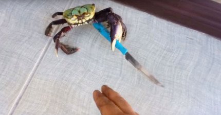 這隻意外撿到一把刀的流氓螃蟹真的太兇猛霸氣了,當不怕死的人類試圖伸手接近他時…