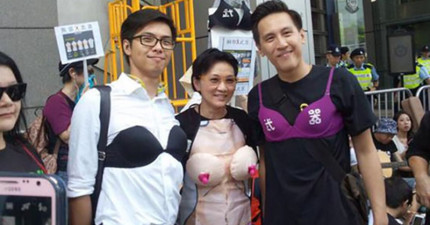 在香港法庭將女子以「胸部襲警」定罪後,上百群眾穿上胸罩上街反擊!