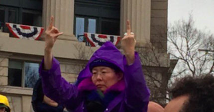 紫衣女子「霸氣比出不是一根而是兩根中指」向川普示威,網友:「美國超級英雄」!