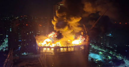 新北預售豪宅大火!「頂樓狂燒」成巨大火把 上百警消急搶救