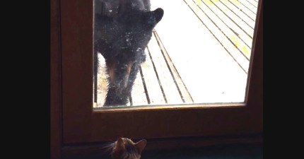 當一隻黑熊步步逼近家門時,這隻貓咪立刻做出「奴才,退下」的霸氣舉動!