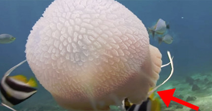 我第一眼還看不出這隻水母有什麼特別,但當牠張開身體開始往上游「看到裡面的東西時」…WOW!