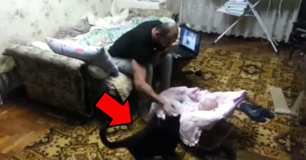 這隻貓咪一看到男子正在攻擊小嬰兒,居然馬上衝了過來…!?