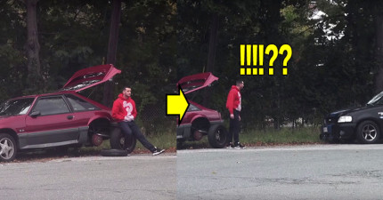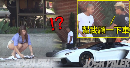 他有事暫離所以隨機請男路人幫他顧車,一開始都相當盡責,直到旁邊一位火辣美女彎下腰撿東西…
