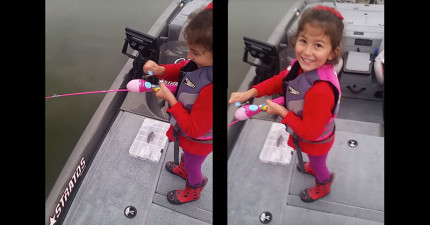 小女孩帶著玩具釣竿和老爸一起釣魚,結果她收線後抓到的巨獸連老爸都放聲大喊:「我的天啊!」