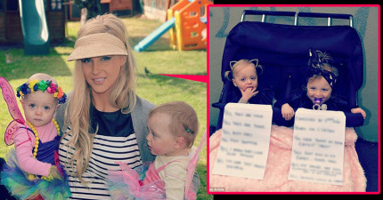 這位媽媽不想一直被問「同樣的雙胞胎問題」,於是在寶寶身上貼了兩張超殺的紙條…