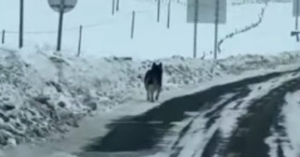一家人爭論:這是狼還是哈士奇? 牠猛然回頭「叼著大餐一臉困惑」真面目讓全車笑翻